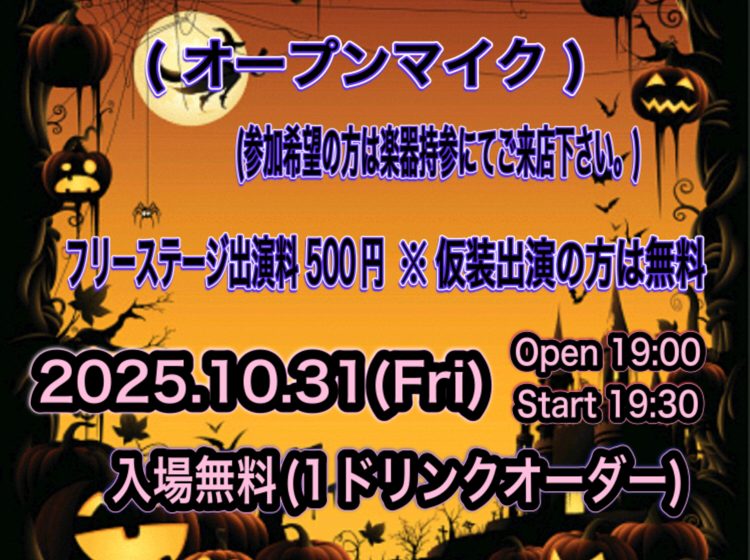 ハロウィンNight(オープンマイク) 10月 31 Fri 2025 フリー ハロウィンNight (オープンマイク) Open / 19:00 Start / 19:30 (来店順) 入場無料(1drink order) フリーステージ参加費 500円(仮装出演の場合は無料) 前のスケジュール 次のスケジュール