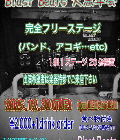 Blast Beats 大忘年会 12月 30 Tue 2025 フリー Blast Beats 大忘年会 Open / 18:30 Start / 19:00 charge / ¥2.000+1drink order 前のスケジュール 次のスケジュール