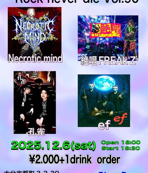 Rock never die Vol.90 12月 6 Sat 2025 ライブ [act] Necrotic mind / ef / 孔雀 / 絶唱FREAk’Z Rock never die Vol.90 date / 2025.12.6(sat) Open / 18:00 Start / 18:30 charge / ¥2.000+1drink order 前のスケジュール 次のスケジュール