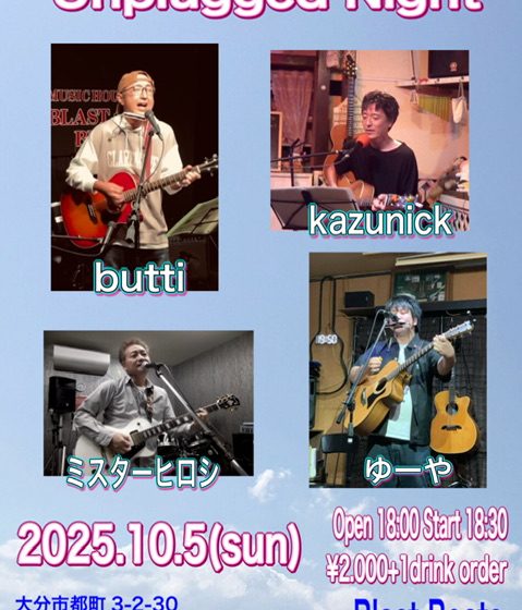 Unplugged Night 10月 5 Sun 2025 アコースティックイベント [act] kazunick / butti / ミスターヒロシ / ゆーや Unplugged Night date / 2025.10.5(sun) Open / 18:00 Start / 18:30 charge / ¥2.000+1drink order 前のスケジュール 次のスケジュール